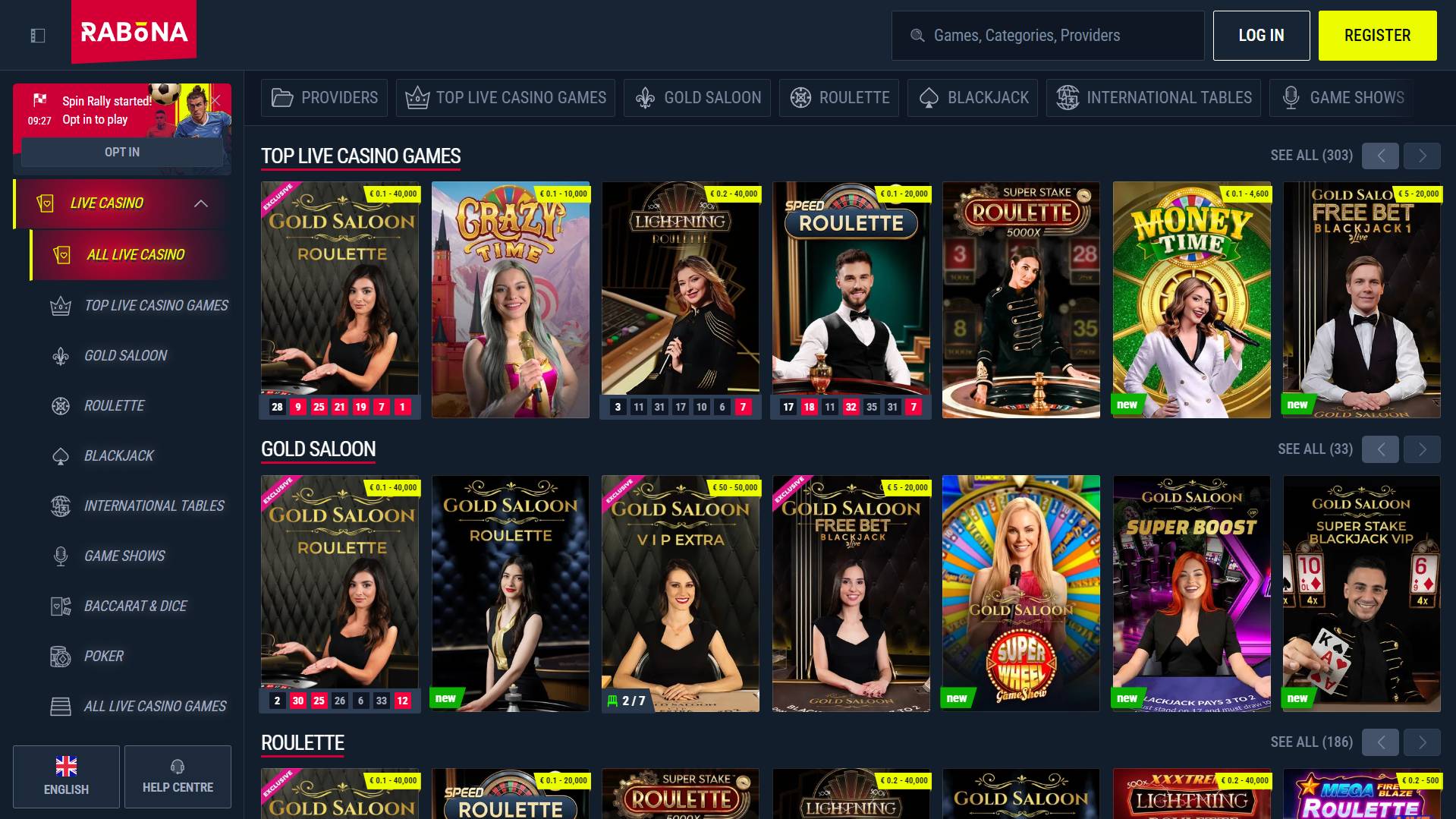 The game selection is built around scale. Rabona Casino offers 11,034+ slot games, covering classic slots, modern video slots, and feature driven categories like Bonus Buys and Megaways. It also offers 845+ live casino games, including live roulette, blackjack, baccarat, and game shows, with content organized through categories and live casino tabs for easier browsing.