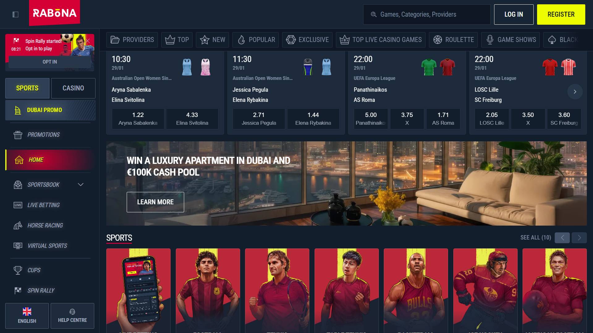 Yes. Rabona includes a full sportsbook section alongside the casino. Slovenian players can use the same account and balance to place pre match and live bets across major sports, with promotions that include a first deposit sports bonus of 100% up to €100. The layout is designed for quick switching between sports and casino content.