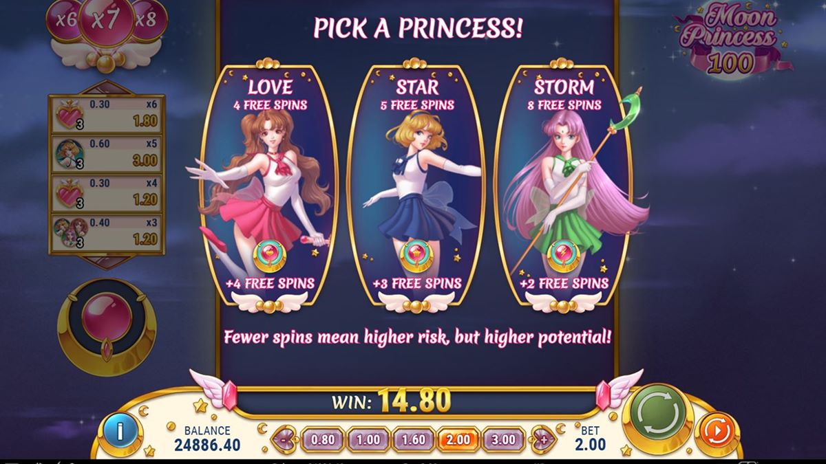 High-Value Symbols: The three Moon Princess characters. Each princess unlocks a different free spins mode, influencing bonus play